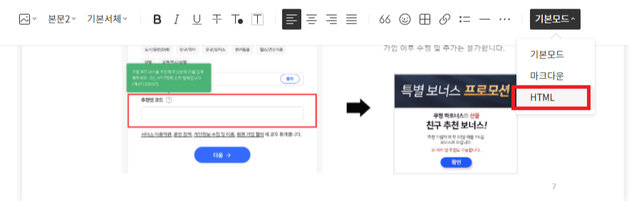 02. 티스토리 본문 상단에 '기본모드'에서 'HTML'로 변경