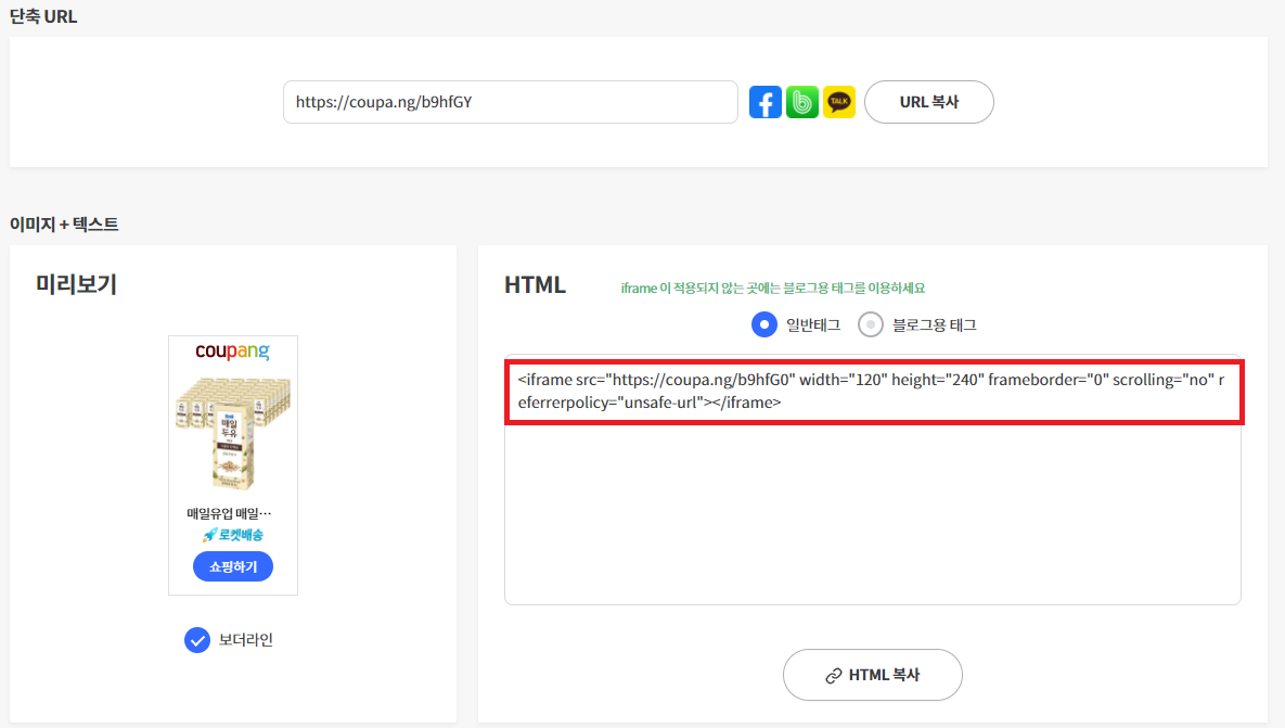 (HTML 기능이 없는 사이트에 작성하시는분은 단축URL을 복사하여 삽입합니다.)